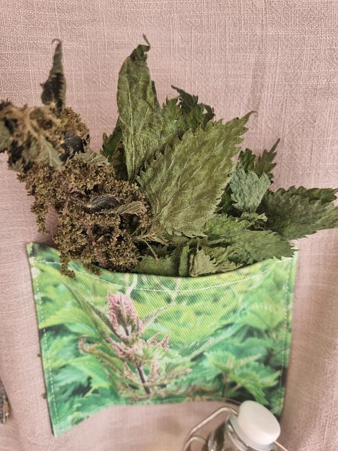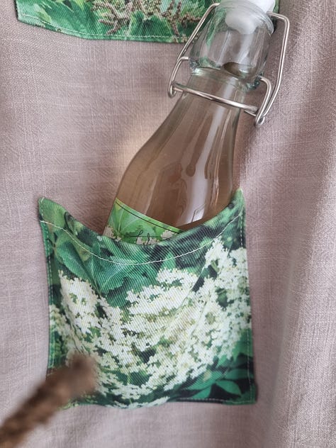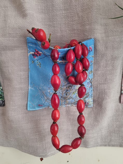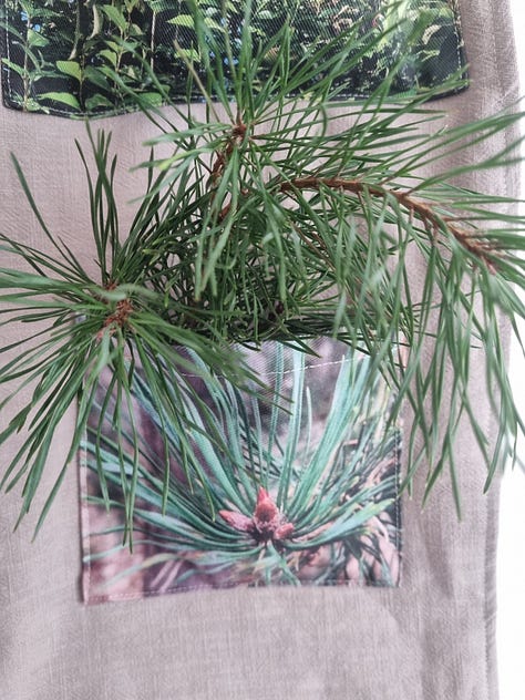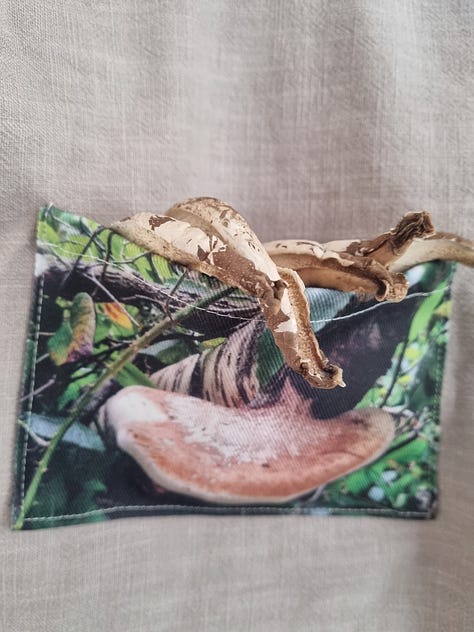 I've wanted to make a foraging apron for some time, so this show became the catalyst, and I set about choosing which wild ingredient would be depicted in each pocket that would loosely relate to the unfolding months of the year. My choices were also based on what I had available to fill the pockets. I chose dandelion for January, a nod to last January’s Commons Feast, where I experimented for the first time with their roots, which are more nutritious in the winter. You can usually find leaves in the mild climate of Southeast England even in the deepest wintry months. Gorse represents February, as this was the first time I learnt that gorse flower was edible, and very much available at this time of year; nettle is March because it is the time of the first flushes of new leaves; April is the best time for wild garlic when the leaves are fully grown; Hawthorn’s other name is May tree; June is the month for elderflower; July offers plums in abundance; August is when many seeds are starting to develop, plantain being one that I regularly gather in this ‘lean’ period. This September the apples were ready, and in mid-October, I found the first magnificent birch polypore specimen of the season; November is when much is starting to die off in the frosts, yet rosehips are still aplenty – red nourishing gems in the hedgerows. Finally, pine is unmistakably Christmassy, and their needles produce more vitamin C in winter.