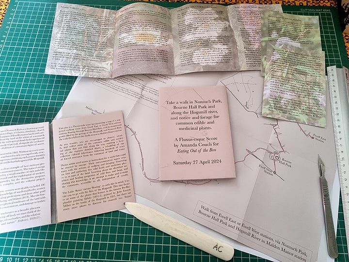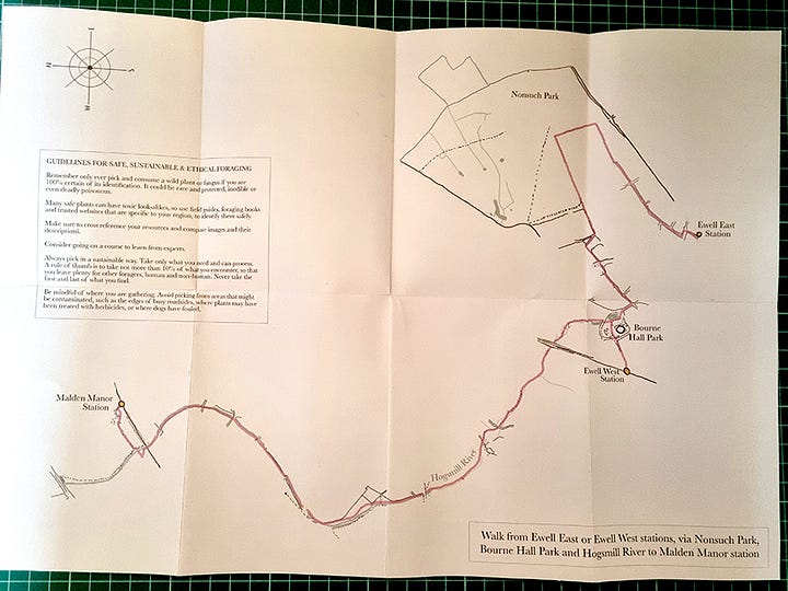 The folded pamphlet form of my recent map/foraging guide made for a student-led curatorial festival, ‘Eat Outside the Box’, also responds to this reference.
